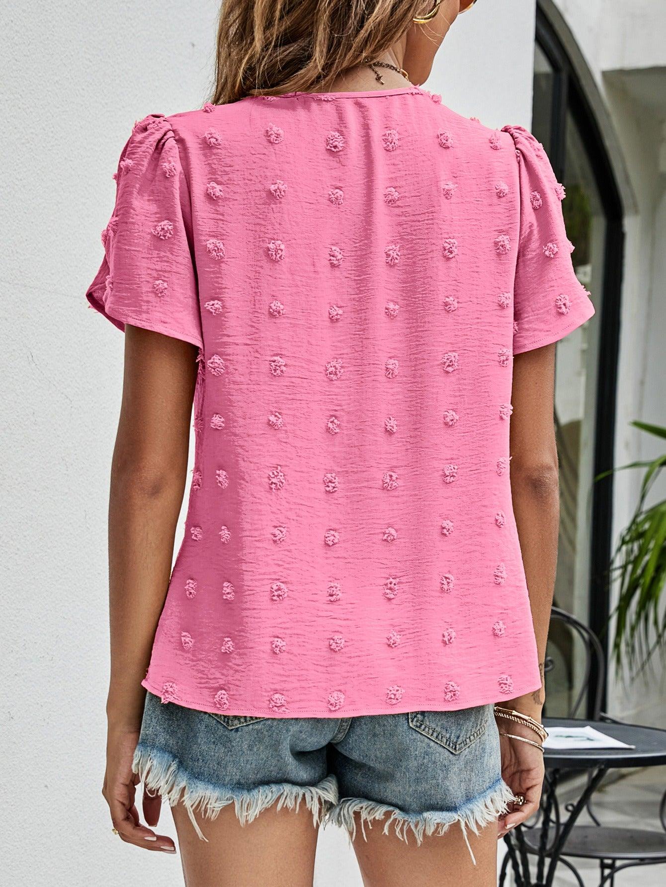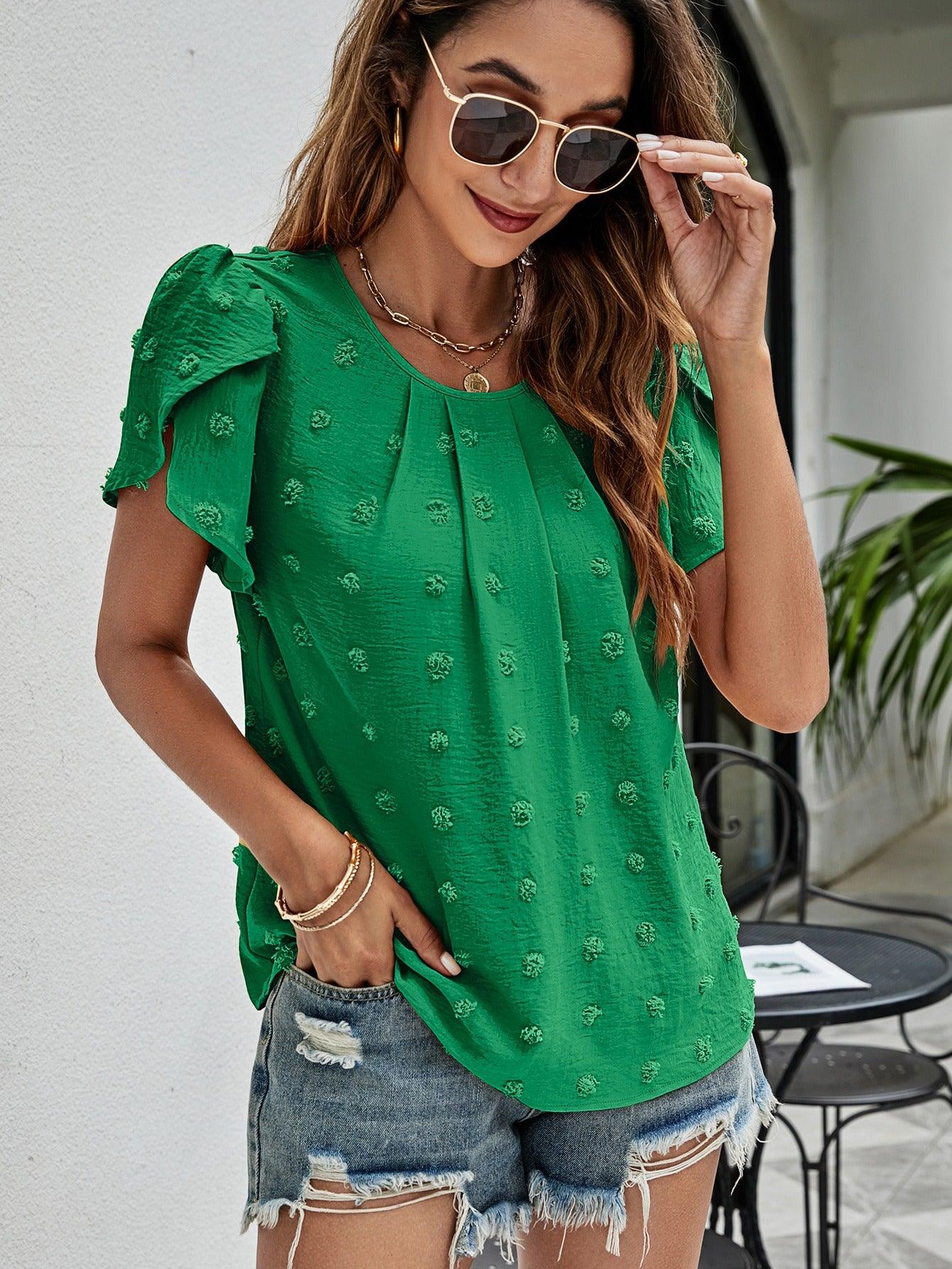 Lift your wardrobe game with this unique Swiss Dot Petal Sleeve Top! Whether you're looking for a chic everyday look or a fresh office ensemble, this top has you covered with its solid color, round neck and petal sleeves. Made with 100% polyester, it's as comfy as it is stylish. Look your best without breaking a sweat!
